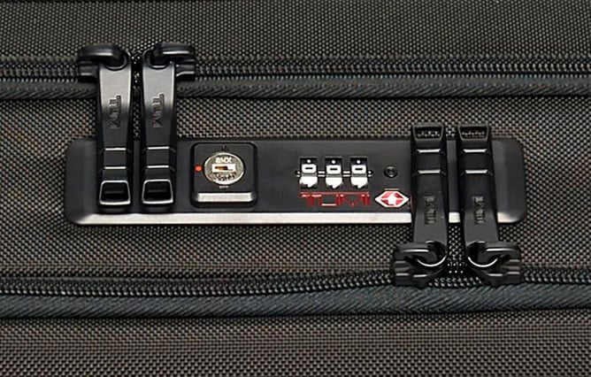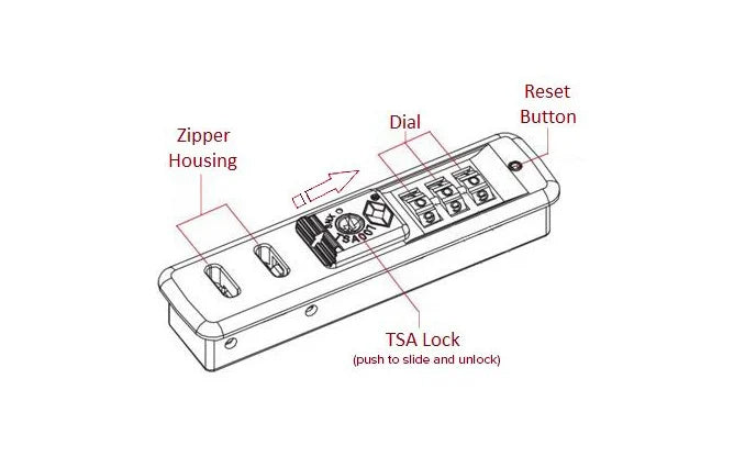 Certifique-se de que cada dígito está configurado no código predefinido em 0-0-0 liberando os extratores de fechamento de sua mala. Para fazer isso, deslize o TSA como indicado pelas setas para desbloquear os fechos.